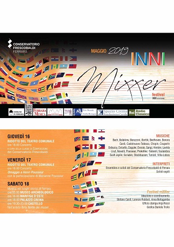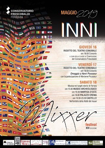 FERRARA – Torna anche quest’anno miXXer festival – Inni, storico appuntamento musicale promosso dal Conservatorio Frescobaldi di Ferrara, nell’ambito de La notte europea dei Musei 2019 e in collaborazione con Ferrara Musica, che si terrà, come ormai consuetudine, nei luoghi più suggestivi di Ferrara dal 16 al 18 maggio. Scelti per la nuova edizione di miXXer festival sono infatti il Ridotto del Teatro Comunale ‘Claudio Abbado’, il Museo Archeologico Nazionale di Ferrara, Palazzina Marfisa d’Este, Palazzo Crema e il Castello Estense. Per la prima volta, la manifestazione vede la partnership di Radio Rai Classica, che manderà in onda a livello nazionale alcuni brani del festival.