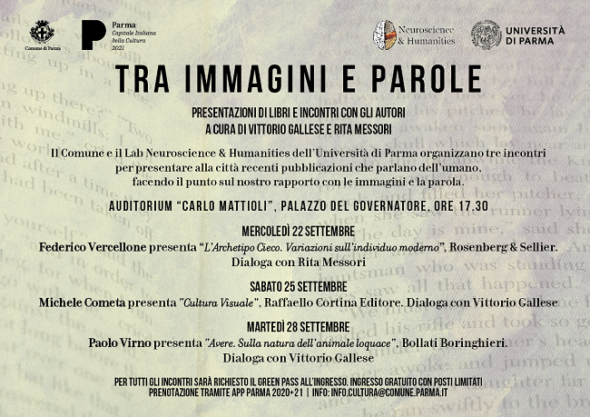 PARMA – Tre presentazioni di libri e incontri con gli autori per riflettere sull’umano, facendo il punto sul nostro rapporto con le immagini e la parola. È l’idea di fondo della minirassegna Tra Immagini e Parole, organizzata dal Comune di Parma e dal Laboratorio Interdipartimentale Neuroscience & Humanities dell’Università di Parma a partire dal 22 settembre.