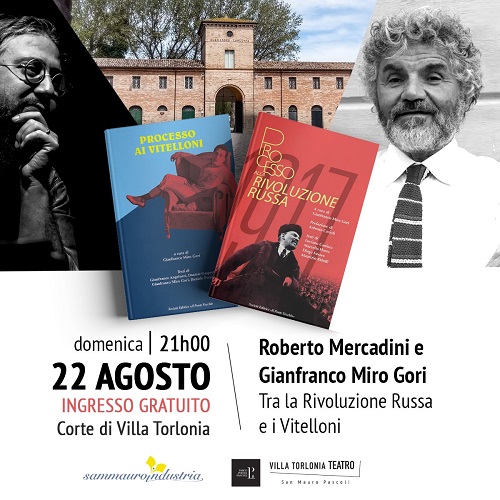 Nato da un’idea di Miro Gori, direttore di Sammauroindustria, i Processi dalle aule di tribunale sono diventati anche dei volumi che raccolgono gli atti di quanto emerso nel corso del dibattimento. Gli ultimi due a essere pubblicati sono “Processo alla Rivoluzione russa” e “Processo a Vitelloni”, entrambi editi da Ponte Vecchio e curati da Gianfranco Miro Gori. I due volumi saranno presentati in anteprima in una speciale serata a Villa Torlonia a San Mauro Pascoli domenica 22 agosto alle ore 21. “Tra rivoluzione russa e i vitelloni”, questo il titolo dell’evento che metterà in dialogo l’attore Roberto Mercadini insieme a Miro Gori. Ai partecipanti sarà consegnata gratuitamente copia dei volumi fino ad esaurimento copie.