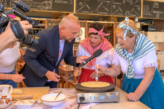 Nel cuore del bar Nettuno, gestito dalla famiglia di Matteo Ceccarini in piazzale San Martino, Massimo Tosi si è cimentato con entusiasmo nell’arte della piadina romagnola, trasformandosi in “azdora” per un giorno. Sotto la guida esperta di Gloria Semprini e delle maestre Maria Rosa e Anna del Consorzio Costa Hotels – Food In Tour (presieduto da Bruno Bernabei), Tosi ha appreso i segreti della tradizione culinaria romagnola, seguendo le direttive del Consorzio di Tutela e Promozione della Piadina Romagnola Igp (presieduto da Alfio Biagini). Un omaggio gustoso a uno dei simboli più autentici della Romagna.