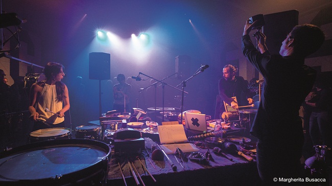 A questo seguono due pezzi di due rappresentanti della cultura della percussione come creatività esecutiva oltre che suono e ritmo. Ma se «Reflets en trio» (2002) per vibrafono, dzembé e marimba dell’argentino Carlos Roqué Alsina lavora sulla convivenza timbrica degli strumenti in un’orgia di sensazioni selvagge ed etniche, «Tribadabum extensif sur rythme fantôme» (1986) di Vinko Globokar gioca tutto sull’improvvisazione degli interpreti. Che non necessariamente devono essere tre, anzi in uno spazio aperto Globokar prevede possano essere tanti di più, a scelta (e qui lo saranno), ognuno con un proprio compito che è quello di materializzare suoni e rumori sia attraverso le percussioni sia attraverso oggetti di uso comune, tenendo a mente un ritmo che è appunto “fantasma” perché precluso invece al pubblico. Il quale avrà modo di immergersi fisicamente in venticinque minuti di azioni e suoni ricreati dagli esecutori su meri suggerimenti gestuali della partitura, in un vortice di sorprese timbriche e di colpi di scena che non precludono minimamente la coerenza di tutto il pezzo.