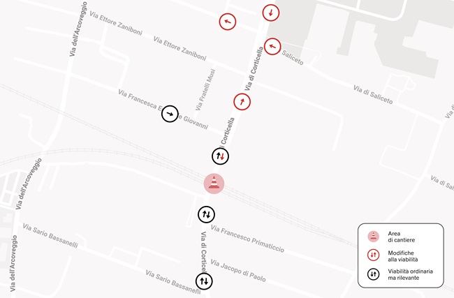 In zona Arcoveggio, accanto all’area in cui si scava da mesi per la realizzazione del sottopasso tranviario, stanno per iniziare anche le operazioni di allargamento del ponte ferroviario di via di Corticella: la struttura esistente sarà sostituita con un nuovo manufatto di larghezza maggiore mediante un intervento che comporterà, dall’8 settembre, la chiusura integrale del segmento di via di Corticella indicativamente compreso tra via Primaticcio e via Edera De Giovanni (incroci esclusi). Verrà quindi istituito un senso unico in direzione periferia da via De Giovanni fino all’incrocio con via di Saliceto, mentre per i soli residenti e accedenti ai passi carrai sarà introdotto un senso unico alternato a vista tra via De Giovanni e il ponte. Di contro, per chi percorre via di Corticella in direzione centro – provenendo dalla zona di Croce Coperta –, ci sarà l’obbligo di svoltare a destra in via Giuriolo, mentre i veicoli in uscita da via di Saliceto dovranno proseguire necessariamente diritto. Resta per il momento invariata la viabilità nella parte a sud del ponte, con una corsia per senso di marcia.