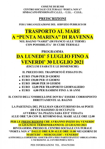 RUSSI (RA) – Il Comune di Russi e il Centro Sociale Culturale Porta Nova, in collaborazione con Sindacato Pensionati Cgil – Uil – Cisl, organizzano un servizio pubblico di soggiorno e trasporto al mare a Punta Marina nel Bagno “Nariz” (di fianco alle terme) con possibilità di cure termali, da lunedì 5 luglio fino a venerdì 30 luglio (esclusi i sabati e le domeniche).