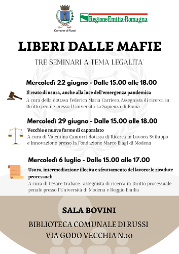 I tre seminari, che si terranno presso la Biblioteca Comunale di Russi (via Godo Vecchia n. 10) nelle giornate del 22 giugno (dalle ore 15.00 alle ore 18.00), 29 giugno (dalle ore 15.00 alle ore 18.00) e 6 luglio (dalle 15.00 alle 17.00), saranno accreditati dall’Ordine degli Avvocati di Ravenna e dall’Ordine dei Dottori Commercialisti e degli Esperti contabili di Ravenna. I temi sui quali verteranno gli incontri sono: