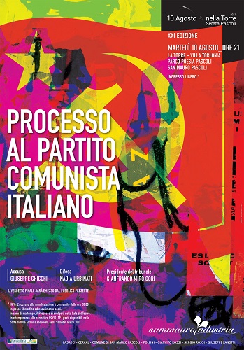 Imputato in questa 21esima edizione del Processo è il Partito comunista italiano, omaggio ai cent’anni dalla fondazione. A guidare l’accusa sarà un ex deputato nonché ex sindaco di Rimini, con un curriculum tutto di sinistra, Giuseppe Chicchi. In difesa del Pci sarà la politologa docente alla Columbia University Nadia Urbinati. Presidente del Tribunale Gianfranco Miro Gori, fondatore del Processo e direttore di Sammauroindustria. Lo scenario è San Mauro Pascoli in quella Villa Torlonia che ha segnato la vita del poeta Giovanni Pascoli (celebre l’omicidio del padre Ruggero Pascoli che amministrava la tenuta). Il verdetto del Processo viene emesso dal pubblico presente all’evento munito di paletta.