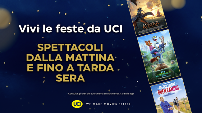Durante il periodo festivo, UCI Cinemas Romagna proporrà spettacoli matinée, ideali per famiglie e bambini e altri in tarda serata, per vivere il cinema anche negli orari più speciali delle feste. Per conoscere gli orari è possibile consultare le pagine dedicate delle singole sale UCI Cinemas sul sito ucicinemas.it