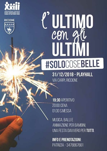 L’appuntamento è per il 31 dicembre alle ore 19.30 a Riccione presso il Playhall in via Carpi. Ad accogliere i partecipanti sarà la prima cittadina della Perla Verde, il Sindaco Renata Tosi. Dopo cena sono in programma musica con balli di gruppo, attività per bambini ed un torneo di calcio-balilla. La festa si concluderà alle 01.30 con una S. Messa di ringraziamento.