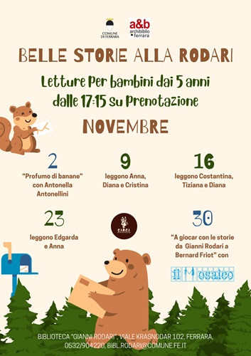 FERRARA – Proseguono gli appuntamenti del giovedì pomeriggio con le ‘Belle storie’ per bambini dai 5 anni alla biblioteca comunale Rodari di Ferrara (viale Krasnodar 102). Il prossimo incontro sarà giovedì 9 novembre 2023 alle 17.15 e a intrattenere i partecipanti con tanti racconti divertenti e coinvolgenti saranno le esperte lettrici dell’associazione Circi Ferrara: Anna, Diana e Cristina.