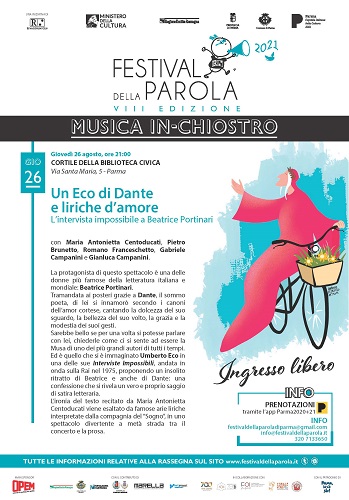 PARMA – Si svolgerà nel cortile della biblioteca Civica, in vicolo Santa Maria, giovedì 26 agosto, con inizio alle 21, l’ultimo concerto-spettacolo della rassegna “Musica In-Chiostro. Note e parole si incontrano”, proposta nell’ambito delle iniziative collaterali al Festival della Parola – VIII edizione: “Un Eco di Dante e liriche d’amore. L’intervista impossibile a Beatrice Portinari”, con Maria Antonietta Centoducati, Pietro Brunetto, Romano Franceschetto, Gabriele Campanini e Gianluca Campanini, propone un insolito ritratto di Beatrice in un divertente spettacolo, a metà tra il concerto e la prosa.