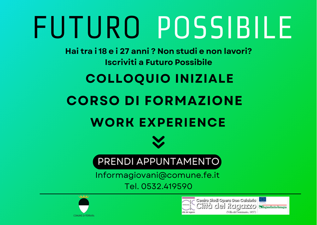 L’obiettivo del progetto è chiaro: riavvicinare i giovani alla ricerca attiva del lavoro, restituendo motivazione, fiducia e strumenti utili per rientrare nei circuiti formativi e occupazionali. ‘Futuro Possibile’ è promosso dall’Assessorato alle Politiche Giovanili (U.O. Nuove Generazioni) del Comune di Ferrara, con l’operatività affidata a Informagiovani, in collaborazione con il Centro Studi Opera Don Calabria – Città del Ragazzo, ed è finanziato attraverso il Piano per il benessere sociale e sanitario del Distretto Centro Nord.