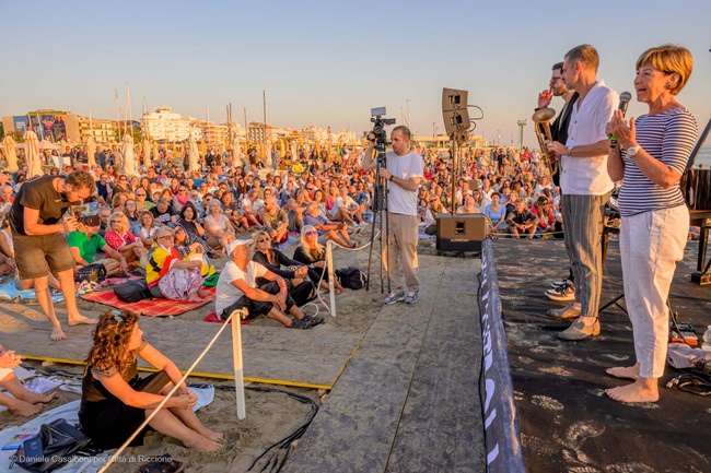 Ieri mattina, la domenica “Sotto il sole di Riccione” è iniziata nel migliore dei modi, in uno scenario mozzafiato che ha premiato le migliaia di persone presenti alla spiaggia Le Palme 88-89 già dalle prime luci del giorno, per assistere al concerto “Il cielo è pieno di stelle. Omaggio alla musica di Pino Daniele” con Fabrizio Bosso e Julian Oliver Mazzariello. Nella suggestiva atmosfera del cielo e del mare che prendevano forma e colore ai primi raggi di sole, la musica di Bosso, uno dei più apprezzati trombettisti del panorama jazz italiano, e le dolci note del pianoforte di Mazzariello, grande pianista e compositore a livello nazionale e internazionale, hanno letteralmente incantato la folla che ha cantato i grandi successi del cantautore napoletano. Bosso è poi sceso dal palco, per suonare in mezzo alla folla, mentre Alessandro Curadi lo ha ritratto dal vivo, con lo strumento che più gli appartiene, la tromba. L’evento tributo a Pino Daniele è stato un appuntamento della rassegna “Albe in controluce, concerti al sorgere del sole sulle spiagge di Riccione”, realizzato in collaborazione con la rassegna “Riccione Summer Jazz”.