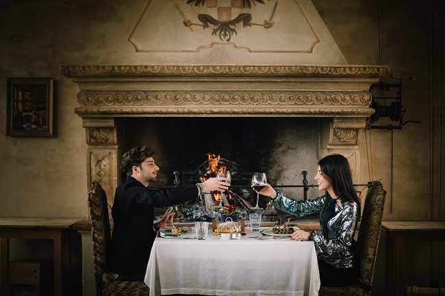 Dopo la vigilia in famiglia, la festa merita di continuare sulla tavola di un avamposto della cucina che apre le proprie porte alle 12.30 del 25 dicembre 2019. Si comincia con la visita alle antiche cantine di stagionatura per un aperitivo di benvenuto con piccole stuzzicherie natalizie accompagnate dallo Strologo Brut metodo classico – Antica Corte Pallavicina 2012. Si prosegue poi in sala da pranzo con un’ouverture affidata al Culatello Platinum Spigaroli, esaltato da una bottiglia di Antica Corte Pallavicina – Strologo Brut Metodo Classico 2013. Il trionfo delle papille entra nel vivo con gli anolini delle terre dei Pallavicino in brodo di terza, il bollito misto della tradizione con mostarda e tre salse e la tacchinetta del Ducato disossata con i marroni di Berceto. Il dolce finale è tutto nel sapore delicato del sorbetto di Fortana con gel di limone e in quello del Semifreddo al panettone con salsa allo zabaione. Nel calice, si susseguono Antica Corte Pallavicina – Rosso del Motto 2016, Antica Corte Pallavicina – Carlo Verdi Riserva 2014 e Antica Corte Pallavicina – Tre Preti Passito 2014. Per chiudere, come da tradizione, i caffè e gli infusi di Corte.
