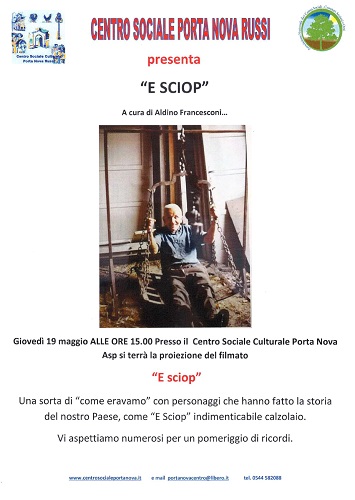 RUSSI (RA) – Giovedì 19 maggio alle ore 15.00 presso il Centro Sociale Culturale Porta Nova Asp, a Russi in via Aldo Moro 2/1, si terrà la proiezione del filmato “E Sciop”, una sorta di “come eravamo” con un girato che mostra i personaggi che hanno fatto la storia del Paese, come appunto “E Sciop”, l’indimenticabile calzolaio.