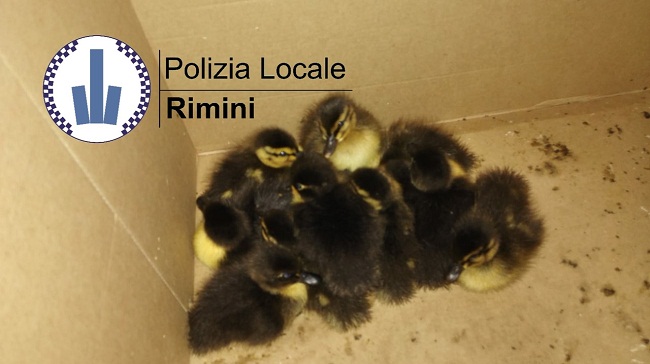 RIMINI – Un inusuale intervento della Polizia Locale si è svolto alle prime ore di questa mattina a Miramare, nei pressi della Statale 16. Dopo la telefonata giunta alla centrale radio operativa, che segnalava la presenza, in via Cardano, di una coppia di germani investiti da un auto, è intervenuta una pattuglia del distaccamento di Miramare che, oltre ad accertare la morte di due esemplari adulti della specie protetta di anatre selvatiche, ha trovato 11 piccoli che pigolavano disperati attorno ai corpi dei genitori, nella speranza di ricevere un segnale.