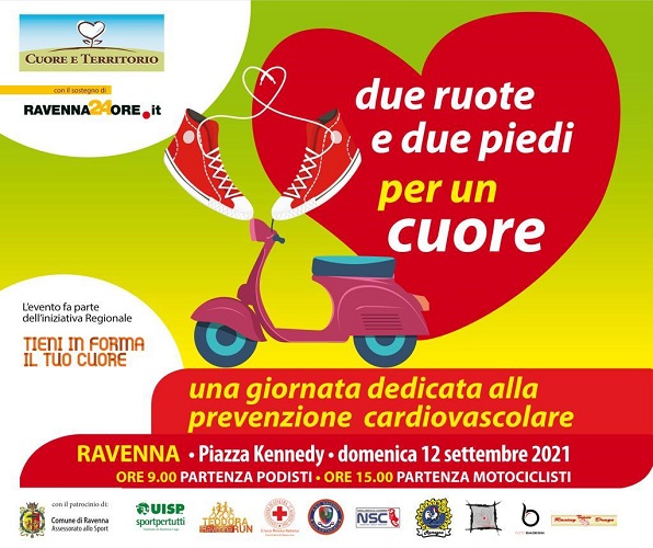 Cuore e Territorio, oltre ad appoggiare e a partecipare all’evento della Regione, arricchisce questa importante giornata dedicata alla prevenzione cardiovascolare, organizzando una doppia passeggiata, prima a piedi poi in moto, per le vie della città. L’evento, dal titolo “Due ruote e due piedi per un cuore”, è realizzato con il sostegno di Ravenna24ore.it, il patrocinio del Comune di Ravenna e la collaborazione di Uisp, Teodora Ravenna Run, Croce Rossa Italiana, Associazione Nazionale Carabinieri, Nuovo Sindacato Carabinieri, Vespa Club Romagna, Bikers for care, Foto Badessi, Racing Team Drago, Bikers For Care.