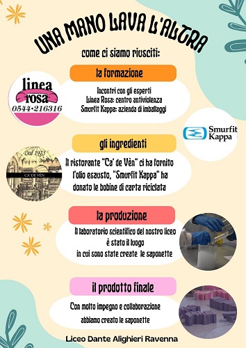RAVENNA – Un programma educativo di economia circolare, concentrato su temi come la green revolution e la riduzione degli sprechi. Un percorso didattico importante che presuppone l’insegnamento di principi di chimica per azioni di riuso e riciclo. E poi c’è l’aspetto solidale con la beneficenza al centro antiviolenza cittadino. Si tratta del progetto “Una mano lava l’altra”, portato avanti dal prof. Pancucci del Liceo Classico Dante Alighieri e 20 alunni/e delle classi quarte.
