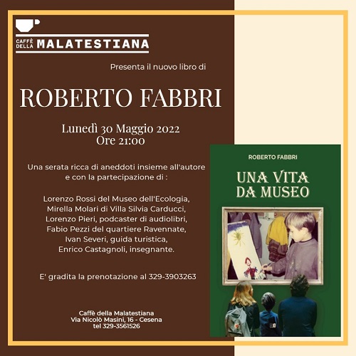Fabbri presenterà il suo ultimo lavoro in una serata al Caffè della Malatestiana, all’interno di Casa Bufalini (via Nicolò Masini 16), in programma per lunedì 30 maggio alle ore 21. Oltre all’autore, è prevista la presenza di Lorenzo Rossi del Museo dell’ecologia; Mirella Molari di Villa Silvia Carducci; Lorenzo Pieri, podcaster di audiolibri; Fabio Pezzi Presidente del Quartiere Ravennate; Ivan Severi, guida turistica ed Enrico Castagnoli, insegnante.