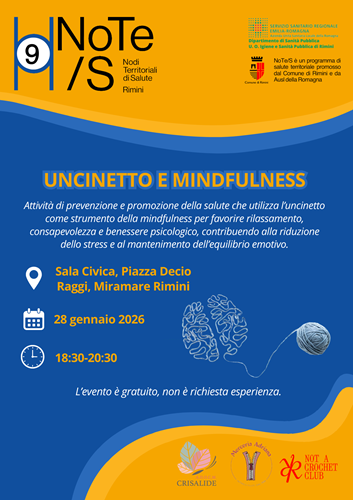 RIMINI – Mercoledì 28 gennaio 2026, dalle 18.30 alle 20.30, presso la Sala Civica di Piazza Decio Raggi a Miramare di Rimini, si terrà l’incontro “Uncinetto e Mindfulness”, un’attività gratuita di prevenzione e promozione della salute rivolta alla cittadinanza.