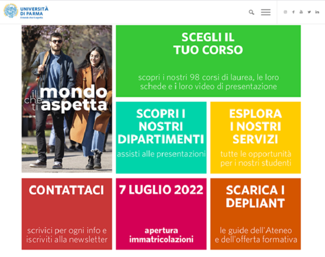Tutte le info sull’offerta formativa 2022-23 e sui servizi dell’Ateneo nel sito web ilmondochetiaspetta.unipr.it/ dedicato alle future matricole. Apertura immatricolazioni già fissata al 7 luglio