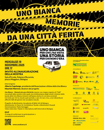 BOLOGNA – Domani, mercoledì 19 novembre alle 17, si terrà l’inaugurazione della mostra Uno Bianca. Memorie da una città ferita, allestita in sala d’Ercole a Palazzo d’Accursio. All’inaugurazione interverranno l’assessora Anna Lisa Boni, il presidente dell’associazione delle vittime della Uno Bianca, Alberto Capolungo e Maurizio Matrone, ideatore della mostra.