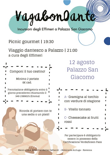 Giovedì 12 agosto alle ore 21 la seconda incursione degli Effimeri nelle stanze settecentesche della tenuta con letture dantesche in italiano e dialetto. Possibilità di picnic gourmet (prenotazione obbligatoria) a partire dalle 19.30