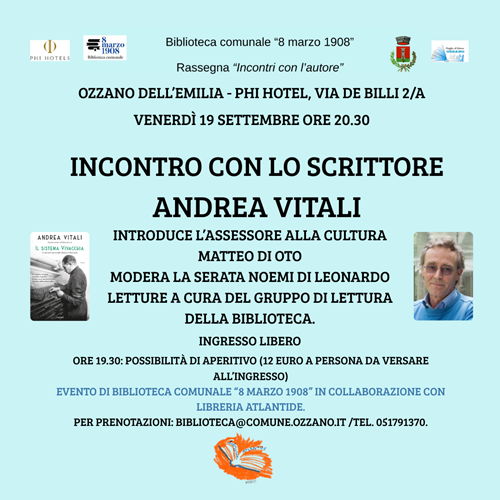 Appuntamento quindi a Ozzano dell’Emilia, venerdì 19 settembre alle ore 20.30 all’interno della rassegna “Incontri con l’autore” della Biblioteca Comunale “8 marzo 1908”.