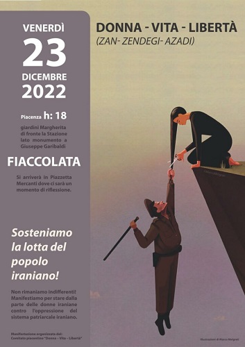 PIACENZA – Mercoledì 21 dicembre in Municipio si è svolta la conferenza stampa del Comitato Donna, Vita, Libertà di Piacenza per la presentazione della fiaccolata di solidarietà per il popolo iraniano che si terrà venerdì 23 dicembre, con ritrovo alle 18 nei pressi della statua di Garibaldi ai Giardini Margherita, di fronte alla stazione ferroviaria.