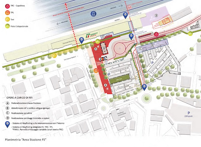 La nuova piazza pubblica di accesso alla stazione ferroviaria di Rimini, i cui lavori sono già in fase di attuazione, è realizzata da RFI in stretta collaborazione con il Comune di Rimini. E’ previsto l’abbattimento da parte dell’Amministrazione Comunale dell’ex sede IAT e la realizzazione in collaborazione con RFI di una grande piazza pedonale. Il progetto dovrà prevedere, fra l’altro, l’integrazione dei percorsi a terra, con adeguamento dei sistemi di indirizzamento dei flussi (segnaletica, totem, pannelli a messaggio variabile, etc.), la continuità delle coperture (pensiline) fra la fermata del Metromare, il parcheggio Metropark e la Velostazione e gli accessi dell’ala “est” della stazione ferroviaria, con particolare attenzione al collegamento con la biglietteria interna al Fabbricato Viaggiatori e delle aree antistanti la nuova uscita a mare.