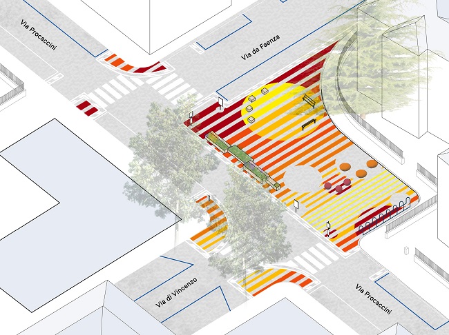 In continuità con l’esperienza di piazza Rossini in zona universitaria e in via Milano al quartiere Savena, il progetto nasce come un’azione di urbanistica tattica: un processo di trasformazione urbana utilizzato dalle città di tutto il mondo che permette di cambiare rapidamente l’uso di strade e spazi cittadini con elementi temporanei e poco costosi, analizzare la loro efficacia e poi adattare il progetto definitivo sulla base delle reazioni di cittadini e cittadine, delle comunità locali e del territorio.