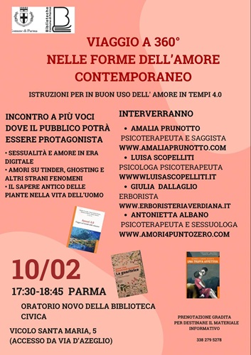PARMA – Come ci si ama nell’era degli smartphone e dell’AI? Tra match su Tinder, love bombing, interazioni virtuali e ricerca di connessioni autentiche, il panorama sentimentale di oggi è diventato un labirinto complesso. Per orientarsi in questo scenario, l’Oratorio Novo della Biblioteca Civica di Parma (in vicolo Santa Maria, 5) ospiterà, martedì 10 febbraio alle ore 17.30, l’evento dal titolo «Viaggio a 360° nelle forme dell’amore contemporaneo: istruzioni per un buon uso dell’amore in tempi 4.0».