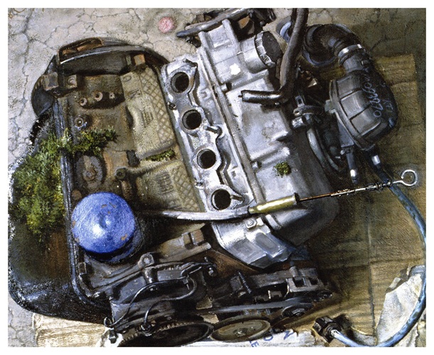 Grazie al riordino del suo materiale, 700 opere che saranno esposte in 16 sedi, la figlia Alighiera Peretti Poggi , che dell’intenso programma di mostre ed eventi “Wolfango 100-100 Wolfango” è instancabile animatrice, ha ritrovato un quadro singolare e di formidabile bellezza. Si tratta de “Il motore di Wolfango”, olio su tela di 150cm per 180, realizzato nel 1978 in circostanze del tutto particolari. «Wolfango non amava i motori – ci ha svelato Alighiera Peretti Poggi- al contrario di mio zio Giorgio Poggi che è stato direttore dell’Autodromo Enzo e Dino Ferrari di Imola fino al 1994 (oggi novantenne ndr). Tuttavia realizzò nel 1978 un lavoro interamente dedicato a un motore a quattro cilindri che si fece portare a braccio, con enorme sforzo, nel suo studio di Via Santo Stefano a Bologna».
