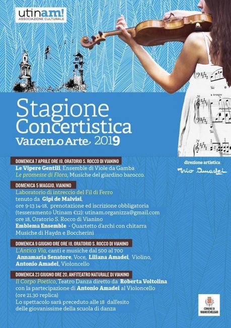 La Stagione Concertistica ValcenoArte è organizzata dall’Associazione culturale Utinam con la direzione artistica del Trio Amadei e il patrocinio del Comune di Varano de’ Melegari. L’ingresso a tutti i concerti è gratuito. Per partecipare al Laboratorio di intreccio del fil di ferro è necessario il tesseramento Utinam (12.00 Euro) e la prenotazione scrivendo a utinam.organizza@gmail.com.