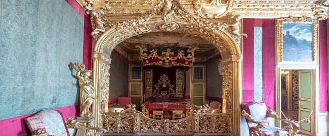 Più che due sedie sono un vero e proprio simbolico “trono dorato”: si trova nella magnifica Rocca Meli Lupi di Soragna (PR) in uno splendido ambiente tappezzato da broccati e velluti di Genova. Vicino al monumentale camino, in cui gli stemmi dei Meli Lupi e dei Rossi figurano uniti, si apre infatti una porta che dà accesso alla Sala del Trono. Il trono feudale, ora rappresentato da due poltrone, è sovrastato da un imponente baldacchino con ornamenti dorati e drappeggi di velluto e broccato. Da notare i due tavoli di ebano con due stipi dell’epoca intarsiati con avorio, madreperla e corallo: l’insieme è sostenuto da eleganti figure marine a tutto tondo in legno dorato. Pregevoli anche i ritratti di Giampaolo e Ottavia Meli Lupi con cornici finemente intagliate. Sono decisamente interessanti anche le statue in legno di Lorenzo Aili, artista trentino naturalizzatosi parmense, rappresentanti la Primavera e l’Autunno, che fanno serie con quelle raffiguranti l’Inverno e l’Estate poste invece nella Camera Nuziale. Vuoi visitare la Rocca Meli Lupi? info@castellidelducato.it – www.castellidelducato.it