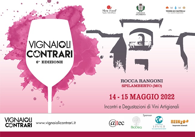 Giunta alla Sesta Edizione nelle giornate di Sabato 14 e Domenica 15 Maggio, nella splendida cornice della Rocca Rangoni, edificio Medievale nel centro storico di Spilamberto (MO), la manifestazione Vignaioli Contrari si presenta come un momento di degustazione e di conoscenza dei vini artigianali da vitigni autoctoni: ospita più di 50 produttori provenienti da tutta Italia e, per la prima volta nel 2022, anche produttori Europei (da Slovenia, Francia e Portogallo). Saranno direttamente i produttori, presenti dietro i loro banchi, a parlare al pubblico dei loro vini. Sarà così possibile degustare più di 200 etichette, ognuna delle quali verrà raccontata direttamente dal vignaiolo che ne ha curato tutta la produzione. La scelta di selezionare accuratamente le cantine partecipanti ha da sempre contraddistinto il tenore della manifestazione, elevando sempre di più la qualità dei vini che si potranno degustare.