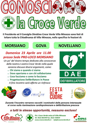 VILLA MINOZZO (RE) – “Conosciamo la Croce verde”: è questo lo slogan che accompagna la manifestazione in programma per la mattinata di domenica 23 aprile nella sede della Pro loco di Morsiano, aperta anche ai residenti di Gova e di Novellano e, in generale, a tutti gli abitanti del territorio comunale.