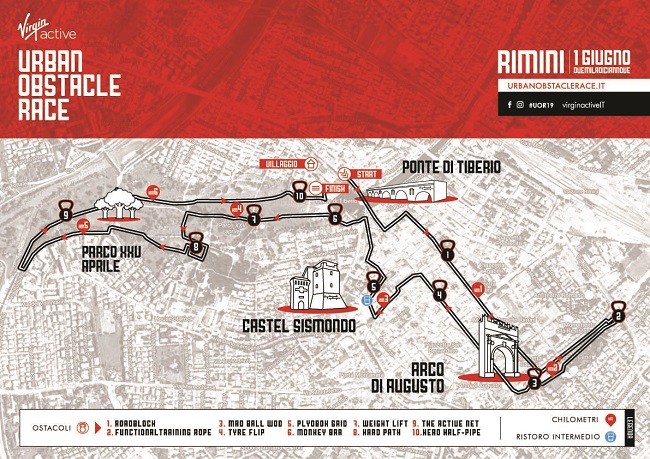 Si parte alle ore 18.00 dal bimillenario Ponte di Tiberio correndo per 7 chilometri e seguendo un percorso che attraverserà l’incantevole centro storico, toccherà Borgo San Giuliano e i due parchi cittadini, tra questi il Parco XXV Aprile. Venue della manifestazione l’alveo del Ponte di Tiberio che accoglierà i partecipanti sin dalle prime ore del mattino (ore 9) per il ritiro dei pettorali con i race kit. (Al Villaggio avranno luogo le varie attività a partire dalle ore 15 sino alle ore 21). Gli ostacoli saranno in totale 10, tutti collegati al functional training e ispirati al land scape urbano. Di seguito elencati: 1.RoadBlock, 2.Functional Training Rope, 3.Mad Ball Wod, 4.Tyre Flip, 5.Plyobox Grid, 6.Monkey Bar, 7.Weight Lift, 8.Hard Path, 9.The Active Net e 10.Hero Half Pipe.