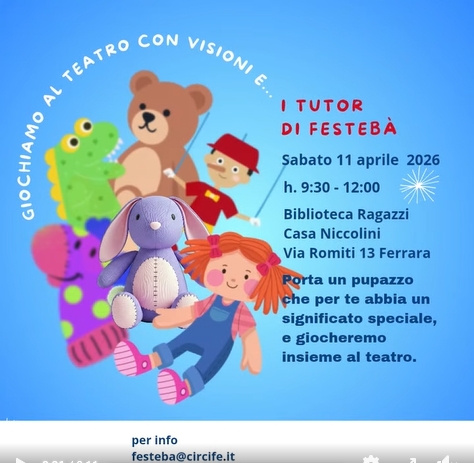 FERRARA – È in programma per sabato 11 aprile 2026 alle 9:30 il nuovo appuntamento con ‘Visioni. Piccola scuola di Festebà Festival’ alla biblioteca comunale di Casa Niccolini (via Romiti 13, Ferrara). Bambini e ragazzi potranno partecipare al laboratorio “Giochiamo al teatro” a cura dei tutor del Gruppo di lavoro di Festebà.