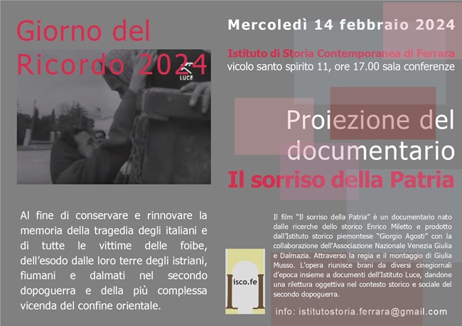 L’iniziativa, curata da Isco.Fe ha l’obiettivo di conservare e rinnovare la memoria della tragedia degli italiani e di tutte le vittime delle foibe, dell’esodo dalle loro terre degli istriani, fiumani e dalmati nel secondo dopoguerra e della più complessa vicenda del confine orientale.