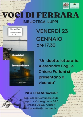 FERRARA – Saranno lo scrittore Alessandro Fogli e la scrittrice Chiara Forlani gli interpreti del ‘duetto letterario’ che venerdì 23 gennaio 2026 alle 17:30 sarà protagonista dell’incontro del ciclo “Voci di Ferrara” alla biblioteca comunale Luppi, di via Arginone 320 (Porotto – Ferrara).