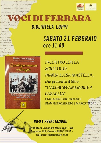 FERRARA – Sarà Maria Luisa Mastella, con il suo libro “L’acchiappamemorie a Casaglia – Persone, luoghi, episodi, ricordi degli anni ’50 e ’60”, la protagonista, sabato 21 febbraio 2026 alle 11:00, del nuovo appuntamento del ciclo di incontri con scrittori e scrittrici ferraresi “Voci di Ferrara” alla biblioteca comunale Aldo Luppi (via Arginone 320, Porotto).