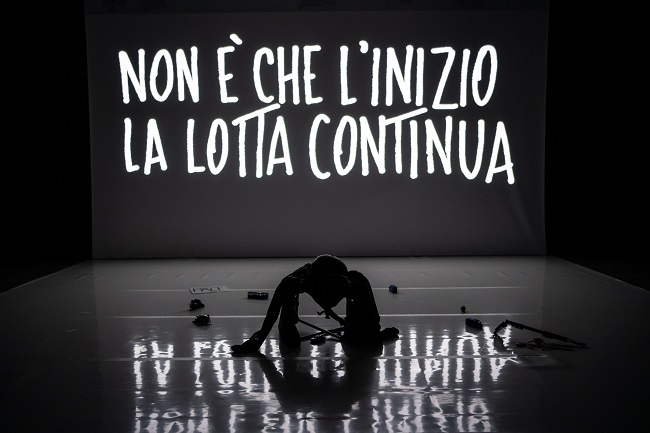 Così lo spettacolo nelle parole di ErosAntEros: “L’immaginazione al potere!”, “Non è che un inizio!”, “La bellezza è per strada!”, “Diamo l’assalto al cielo!”, “Prendete i vostri desideri per realtà!”. Questi sono solo alcuni degli slogan che hanno invaso le strade delle città studentesche nel Sessantotto. Un fenomeno incendiario che in diversi paesi e con modalità differenti ha provocato rivoluzioni in tutti gli ambiti della società e che viene da ErosAntEros ripercorso all’interno di un flusso di testo interpretato da una sola figura in scena. È una giovane militante in abiti contemporanei che si trova nella situazione paradossale di voler trasmettere lo slancio e la dimensione collettiva delle lotte in completa solitudine, utilizzando le parole di ieri come fossero quelle di oggi, contrappuntata da un montaggio video in cui le immagini d’archivio si mescolano a quelle odierne per far emergere rotture e analogie. Per farlo abbiamo raccolto le testimonianze dei protagonisti del ‘68 e intervistato i giovani attivi nei movimenti di oggi. Le voci dei militanti contemporanei, assieme alle canzoni di lotta del passato e del presente, concorrono alla creazione di un paesaggio sonoro che trae ispirazione dalle composizioni per voce e nastro di Luigi Nono.