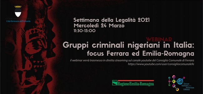 FERRARA – Un Webinar dedicato a “Gruppi criminali nigeriani in Italia: focus Ferrara ed Emilia-Romagna” con la presentazione della ricerca promossa dall’Ufficio sicurezza dal Comune di Ferrara e realizzata con il contributo dell’Area Sicurezza Urbana e Legalità della Regione Emilia-Romagna. È questo il tema della video-conferenza in programma per mercoledì 24 marzo 2021, dalle 11.30 alle 13 a cura del Comune di Ferrara con il contributo della Regione Emilia-Romagna e il patrocinio di FISU-Forum Italiano per la Sicurezza Urbana.
