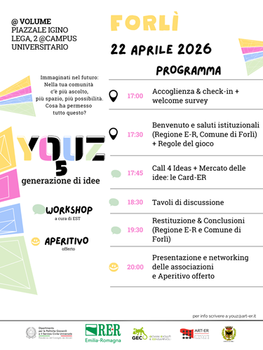 La tappa, realizzata in collaborazione con il Comune di Forlì, sarà dedicata in particolare a ascoltare e co-progettare con ragazze e ragazzi le future politiche giovanili, attraverso attività laboratoriali e momenti di restituzione collettiva, in un contesto informale ma strutturato.