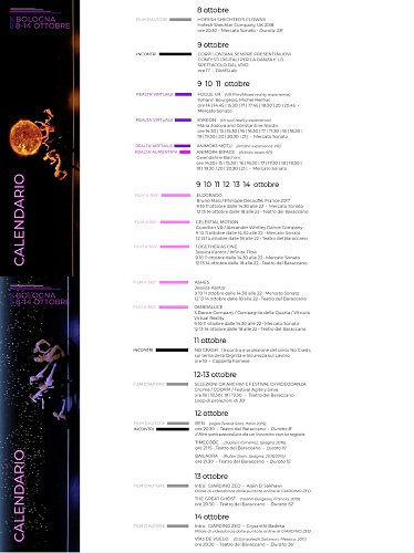 Per tutta la durata del Festival sono a disposizione 5 caschi VR con una selezione di film con proiezione a 360°: Eldorado, un’opera che trasporta lo spettatore dentro i paesaggi mentali che animano l’immaginario del grande coreografo Philippe Decouflé con la regia di Bruno Masi e coreografie di Philippe Decouflé; Celestial motion, in cui la danza contemporanea si unisce alla tecnologia motion capture per esplorare dall’interno il movimento in una dimensione tra l’umano e l’astronomico, coreografia di Alexander Withley; Together as One, è un viaggio immersivo nel mondo della danza con disabilità in cui la realtà virtuale e l’animazione assicurano la partecipazione alle emozioni dei danzatori, regia di Jessica Kantor, coreografie di Infinite Flow, an Inclusive Dance Company; Ashes, diretto da Jessica Kantor, trasporta lo spettatore in una vasta spiaggia per assistere ad una piccola storia d’amore, raccontata giocando col movimento, lo spazio e il tempo grazie al visore VR; OmbraLuce approfondisce le potenzialità e le possibilità della percezione partendo da un ipotetico spazio scenico. Corpo, luce e musica operano contemporaneamente per creare una dimensione spaziale onirica che viene elaborata, moltiplicata, amplificata e trasportata nella realtà virtuale generando una nuova modalità percettiva dello spazio e degli elementi che lo compongono. Totalmente immerso nell’esperienza VR, lo spettatore vede emergere del buio luci, corpi ed essenze che trascendono da ciò che siamo abituati a chiamare realtà e a percepire come verità. (S Dance Company / Compagnai della Quarta / Vitruvio Virtual Reality / Laboratorio Aperto con il contributo di ERT e Regione Emilia Romagna).