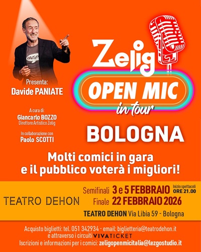 Al Teatro Dehon di Bologna arrivano gli Zelig Open Mic, un progetto a cura di Giancarlo Bozzo – Direttore Artistico Zelig, in collaborazione con Paolo Scotti, in scena il 3 e 5 febbraio ore 21 per le Semifinali e il 22 febbraio ore 21 per la Finale.